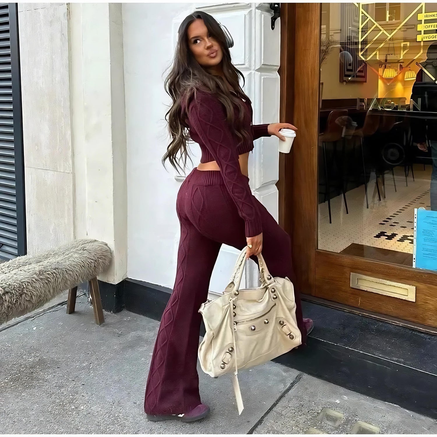 The cropped cardigan offers a chic touch with its button-front design, while the flare pants elongate your legs for a flattering silhouette. The cable-knit texture adds a stylish, textured detail that looks just as good on the couch as it does at your favorite coffee shop.